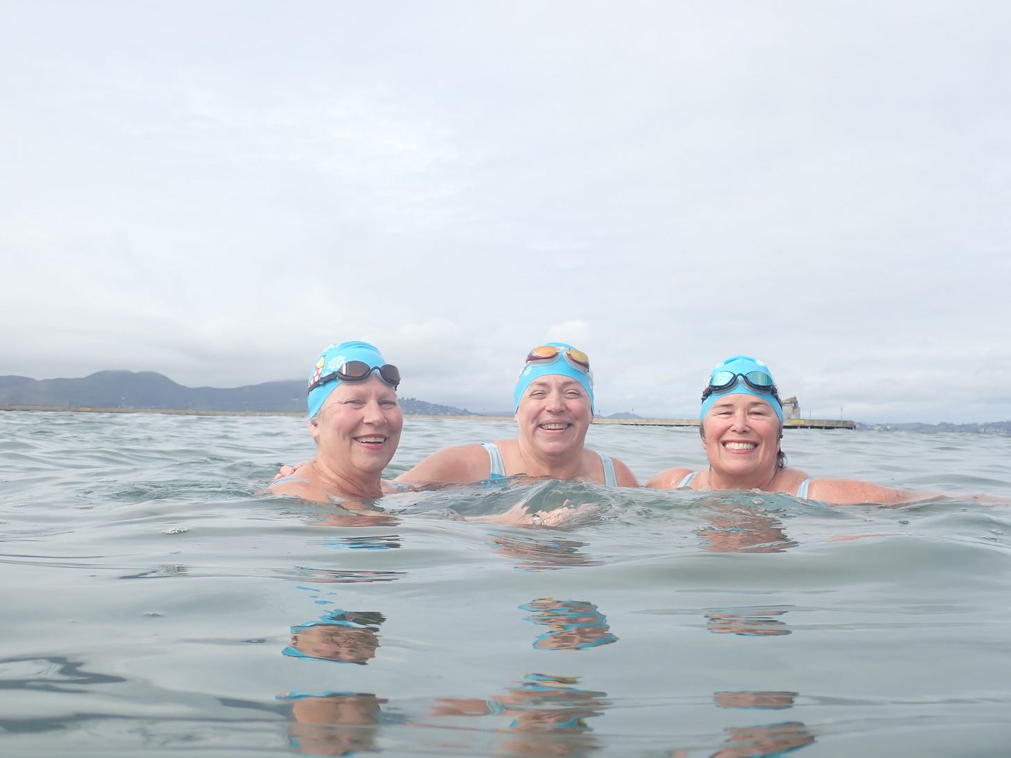 Shivering on the beach in the lashing wind, I cringe as the 53°F water of San Francisco Bay kisses my toes in the cold sand of Aquatic Park. Why do I do this? I ask myself. Why don’t I wear a wetsuit? What’s so great about swimming through winter?