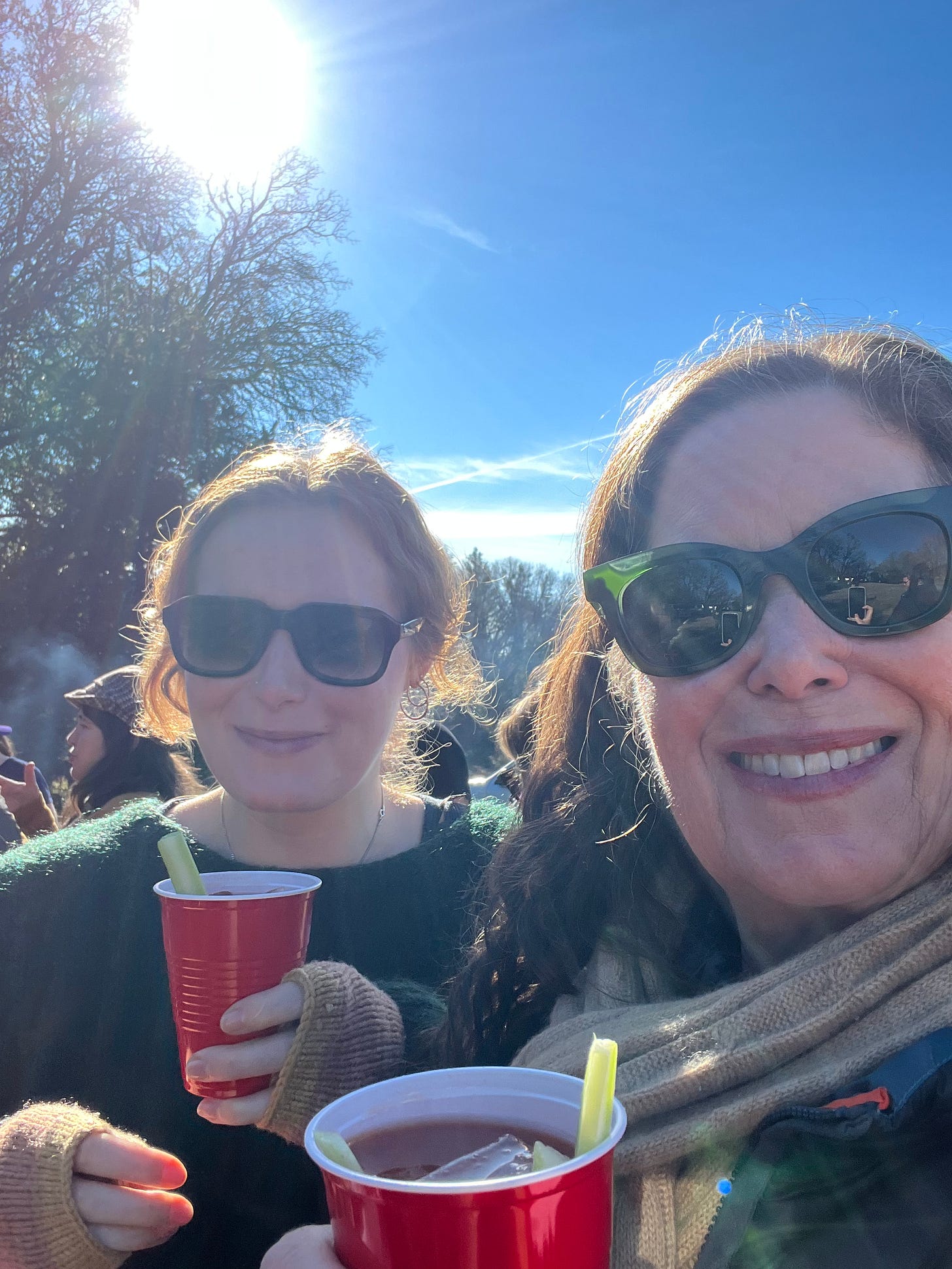 In the mild weather, we quickly set up a fire pit (thought it was so warm, no one needed it), set up banquet tables and covered them with red and white checked tablecloths. Some brought home-cured coppa and blood sausage; others store-bought sliced mortadella, salami, prosciutto, and turkey. My favorite is to slice apart the plain foccacia and stick a pile of mortadella in there. Mmmmm! Homemade chocolate chip and molassses-ginger cookies filled the table next to peanut brittle, gummy bears, and tangerines. My uncle Ken brought his famous Bloody Mary mix and all the fixings. My uncle Jeff brought three gallon jugs of the family red wine. For close to two hours, we all grazed and drank, catching up on each other’s news and talking about plans for the bi-annual family Christmas dinner.